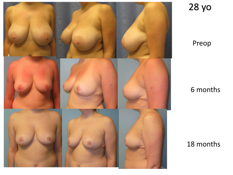 Initially expect your breasts to be sore, swollen, and possibly bruised. You will need to wear a surgical support bra at all times (except for when showering) for approximately 3 to 4 weeks to minimize swelling and help your breasts heal in the desired shape. Most patients can return to non-strenuous jobs, school, and everyday activities within 1 to 2 weeks, gradually working up to strenuous exercise and high-impact activities after about a month.The resulting scars are usually thin and fade from pink to white over the following months to 1 year.